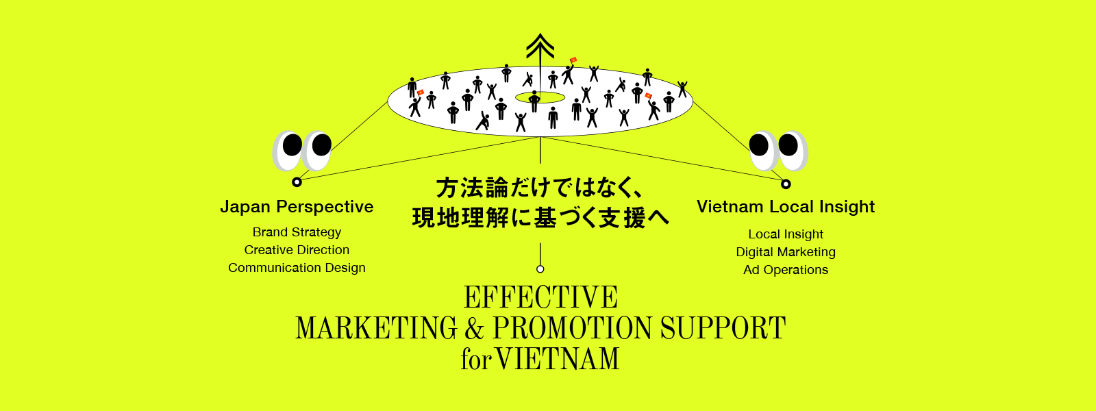 日本発の戦略的な視点と、ベトナムに根ざしたローカル知見を掛け合わせ、一つのチームで動かすことで、確実にターゲットを動かすマーケティングを実現します。