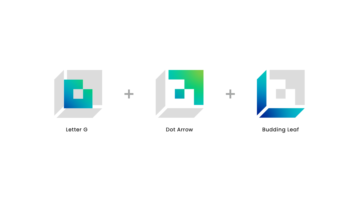 The logo combines a "dot arrow" as a symbol of business progressing through digitalization, and a "budding leaf" to represent the way a company grows through business development. The overall form is based on the first letter of the service, G. It expresses the way a business grows through the service and opens up new possibilities like budding leaves.